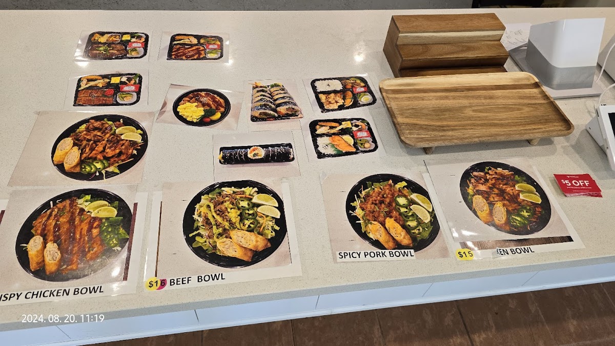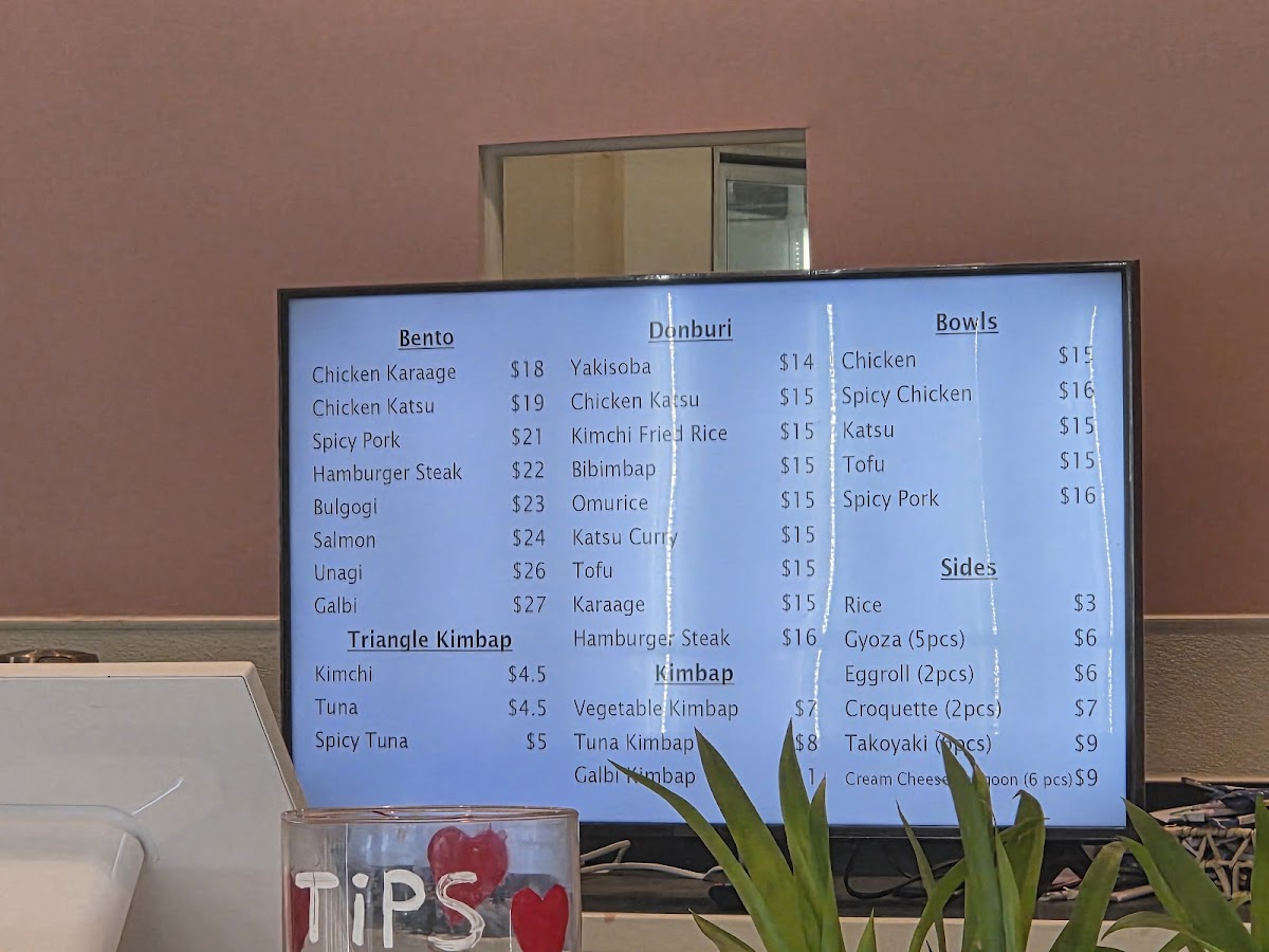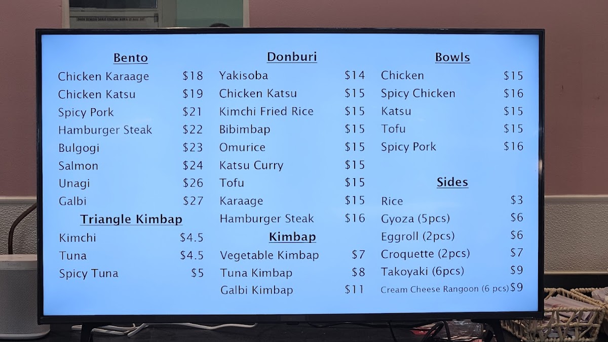 From a reviewer’s perspective, the menu at Momo Bento offers a satisfying variety of Korean- and Japanese-inspired comfort dishes that feel both approachable and well-rounded. The selection of kimbap, including Tuna Kimbap, Vegetable Kimbap, Galbi Kimbap, and Kimchi Kimbap, alongside options like California Rolls, provides a quick yet flavorful start. The triangle kimbap lineup-such as Tuna Triangle Kimbap, Beef Triangle Kimbap, and Spicy Tuna Triangle Kimbap-adds a convenient grab-and-go appeal. For heartier meals, the bowls like Pork Bowl, Spicy Pork Bowl, Chicken Bowl, and Tofu Bowl deliver comforting, familiar flavors, while the bento boxes-especially Chicken Karaage Bento, Chicken Katsu Bento, Salmon Bento, and Unagi Bento-stand out as complete, satisfying meals. The donburi section, featuring Omurice Donburi, Bibimbap Donburi, and Kimchi Fried Rice Donburi, rounds out the menu with classic favorites. Sides such as Croquette (2 Pieces), Miso Soup, Cream Cheese Rangoon (6 Pieces), and Vegi Mixed Tempura (4 Pieces) complement the mains well, making the overall menu feel thoughtfully curated even without listed prices.